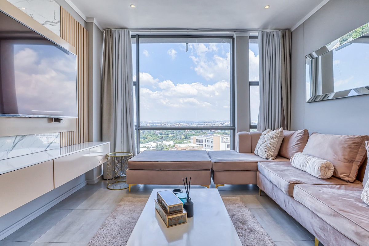 Ang naka - istilong apartment na may dalawang silid - tulugan na hotel na ito ay tahanan na malayo sa bahay na may napakaraming luho . Available din ang lahat ng serbisyong makukuha mo sa panahon ng pamamalagi sa hotel. Nag - aalok ang marangyang apartment na ito ng serbisyo sa kuwarto. Isa rin itong bar sa ibaba, restawran, gym, at spar sa ibaba. 5 minutong lakad ang layo ng Sandton City at Mandela Square mula sa hotel.