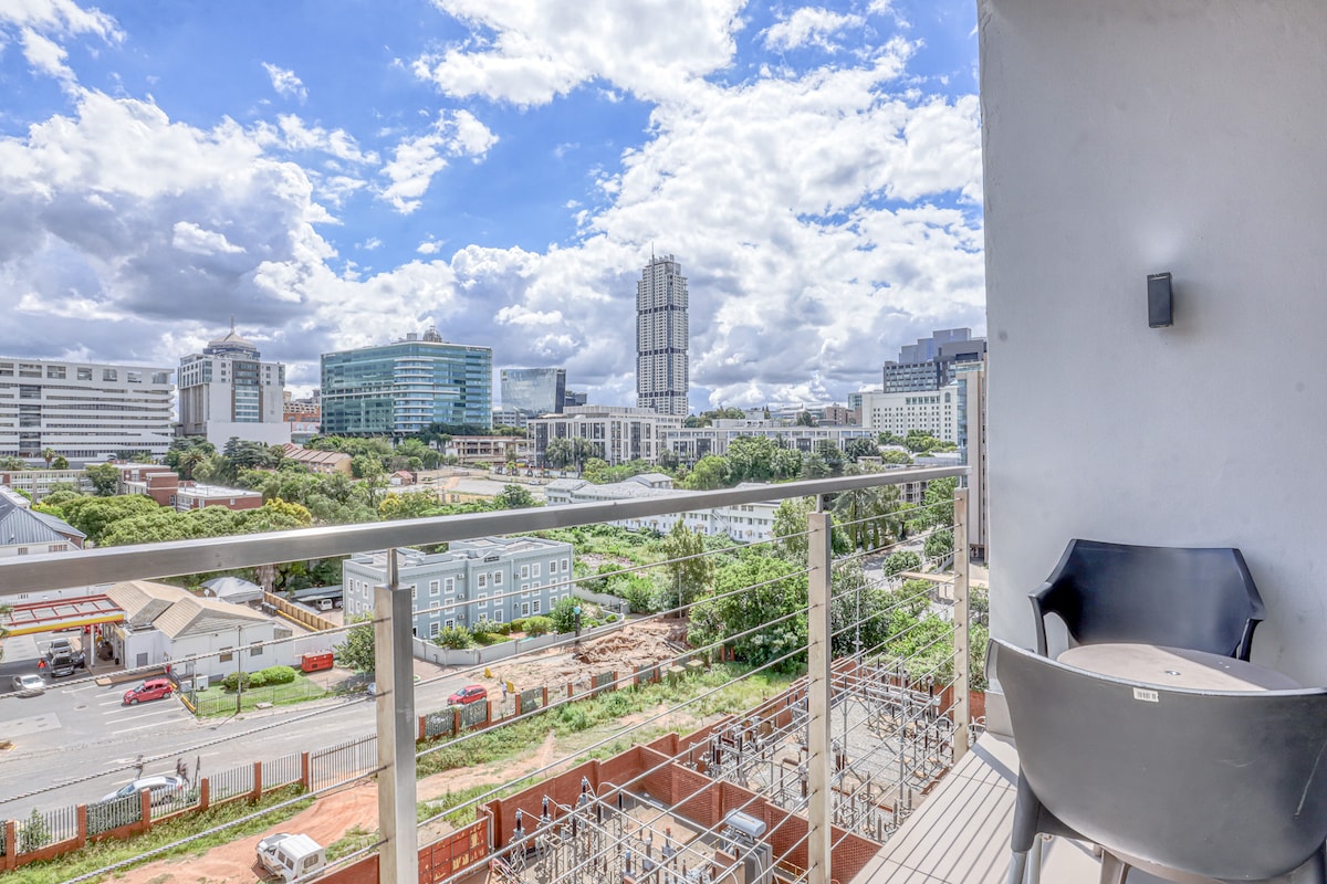 Nasa gitna ng Sandton. 7 min lang sa Sandton city at Gautrain station at marami pang atraksyon. Isang kumpletong kumpletong studio apartment sa gitna ng Sandton Maluwag na open plan na may king-sized na higaan at open plan na kusina na may seating area. May aircon sa buong lugar Nag-aalok ang Sandton Skye ng: -24 na oras na seguridad -24 na oras na concierge -Laundromat (gamit ang token) - Pool sa labas - Cocktail bar - Gym - Restawran (CodFather) - Ligtas na paradahan sa basement