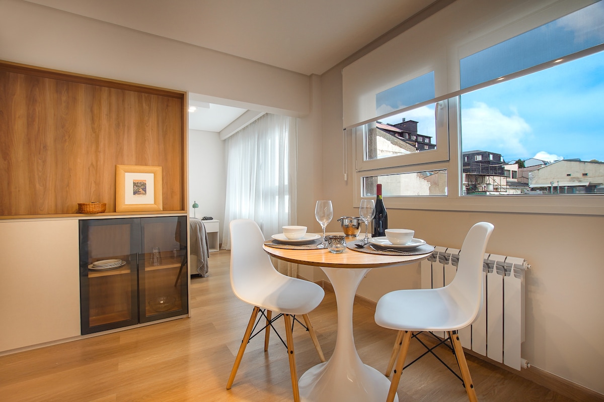 Napakaliwanag na studio, na magagamit para sa 1 hanggang 2 tao na kumpleto sa kagamitan. Matatagpuan ito sa ika -7 palapag ng gusali, mayroon itong Queen size bed, dining room, 65"Smart TV, buong banyo, balkonahe, at higit sa lahat, 22m2 maluwag na terrace, pribado at eksklusibo, at isa sa mga pinakamahusay na malalawak na tanawin ng lawa at burol ng lungsod. Magkakaroon ka ng pambihirang karanasan sa iyong bakasyon o biyahe sa trabaho.