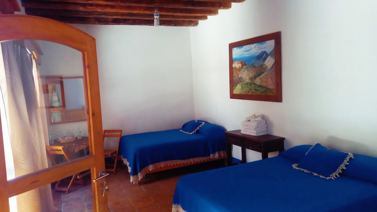 Tradisyonal na tuluyan na pinalamutian ng mga orihinal na muwebles na matatagpuan sa loob ng village na 7 minutong lakad mula sa pangunahing plaza Privacy, pahinga at pagpapahinga Napapalibutan ang bahay ng humigit - kumulang 1000 metro ng lupa kung saan puwede kang makipag - ugnayan sa kalikasan. Mga amenidad: may ilaw na kiosko, ihawan, duyan, muwebles sa hardin, fire pit area. Mga kamangha - manghang paglubog ng araw at malamig na gabi Hindi kami hotel ( privacy) Ang maximum na kapasidad ng bahay ay 7 bisita (kasama ang mga menor de edad at may sapat na gulang)