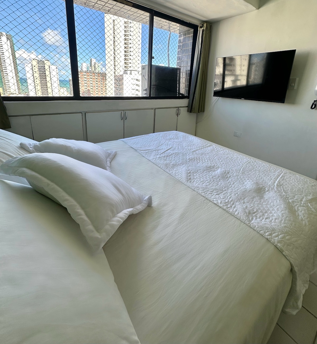 Studio sa Boa Viagem na may magandang tanawin ng dagat, komportable at mahusay na kinalalagyan: 🏖️12 minutong lakad papunta sa pinakamagandang lugar ng Boa Viagem beach; ✈️ 15 minuto mula sa paliparan; 🛍️ 8 minuto mula sa Shopping Recife; 📍 Malapit sa merkado, panaderya, restawran at bar. Sa tabi ng Via Mangue, na isa sa mga pangunahing daanan papunta sa North Zone, ang Recife Antigo at Olinda. Ang gusali ay may 24 na oras na pasukan, isang mini market, isang smart laundry room at isang rooftop pool na may magandang tanawin. Nag - aalok kami ng garahe.