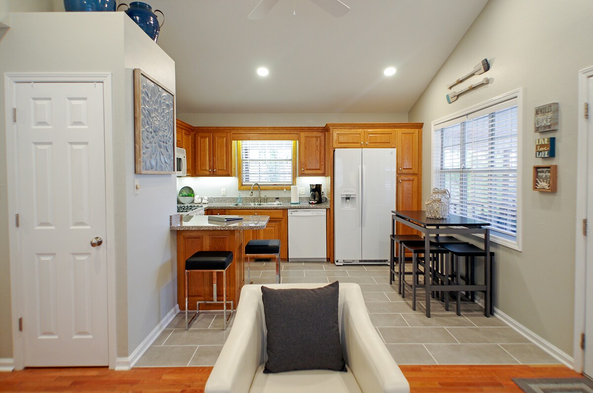 This charming little cottage is new construction, designed in the “industrial farmhouse chic” style. It’s the perfect place for a romantic getaway or a relaxing country adventure. Take in the wooded views from the screened-in back porch, walk down to the lake, or enjoy a day out in downtown Granbury! If you're lucky you may even see the neighborhood road runner. He loves to use our back porch as a hiding spot!We’d love to have you, so come stay a while.