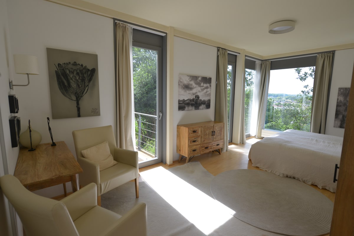 Within a 6000 sqm plot below the Veste Coburg you get a bungalow with every comfort. 3 rooms, 100 sqm, with kitchen (equipped with everything), two bathrooms, secluded terrace with large garden. Absolutely quiet and yet right in the middle of it all. 5 minutes by car and 10 minutes on foot to the center. High-quality furnishings. Floor-to-ceiling windows with a wonderful view of nature and Coburg. Ferienhaus - Waldblick - Coburg . De