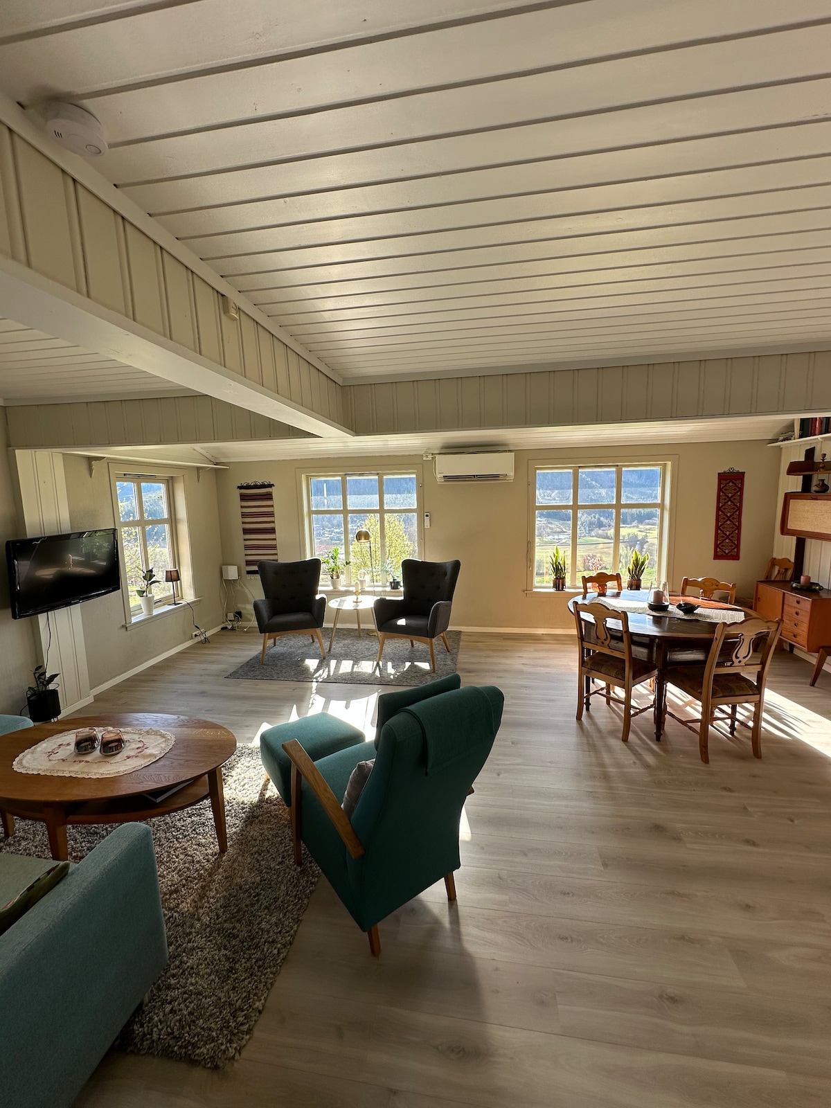 Modern and cozy apartment on the first floor. Living room and kitchen with cooking facilities and fridge. Tiled bathroom with washer and dryer. Spacious bedroom with large double bed (200x180) Good parking spaces right by the house. Access to garden with outdoor furniture. Great view towards the center of Vinje and Lønahorget. Hiking trails and activity opportunities right outside the doorstep. Walking distance to grocery and gas station.