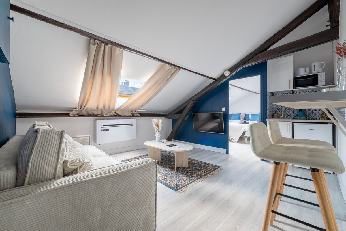 Kaaya - ayang inayos na loft style apartment na matatagpuan sa unang palapag (walang elevator) ( kasama ang pangalawang hagdan sa apartment , )malaking sala na may bukas na kusina, dalawang silid - tulugan na may shower room, lahat ay naka - air condition malapit sa Katedral ng Reims. Apartment na may: Nespresso coffee maker, kettle, toaster, dishwasher, washing machine/dryer, ironing table, iron, hair dryer, linen (sheet at bath towel)