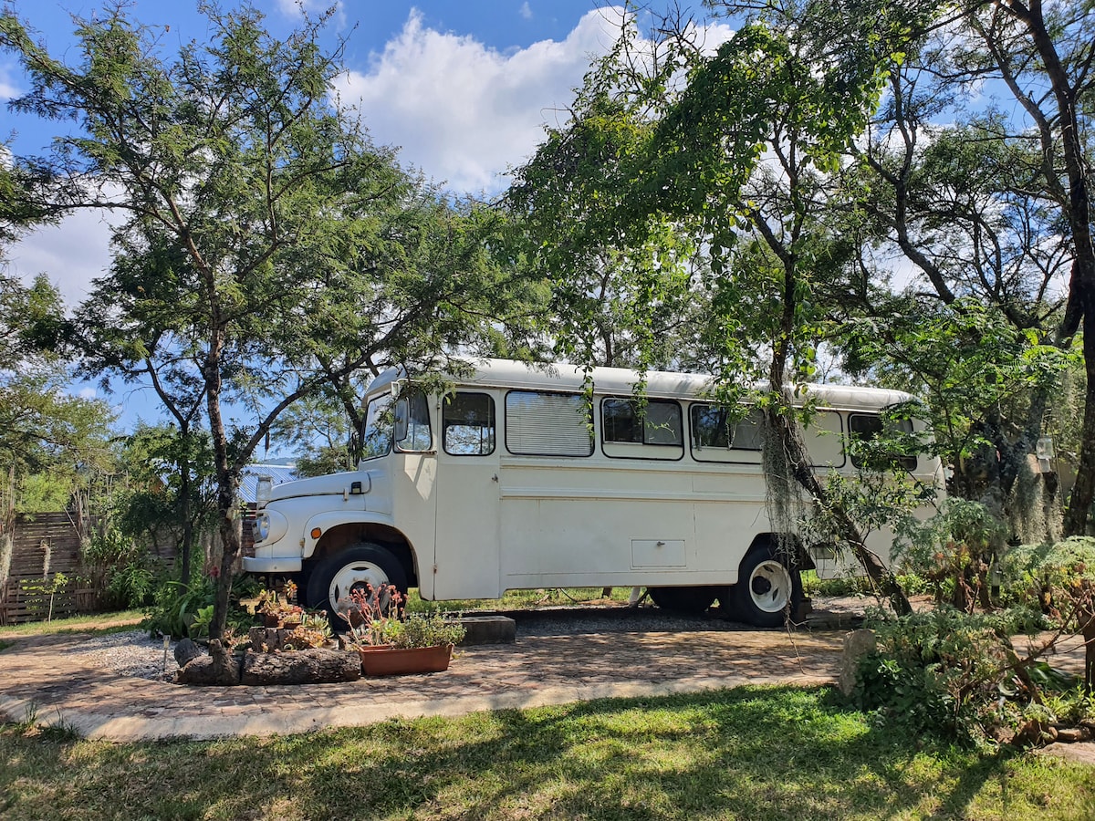 Mag - enjoy sa pamamalagi sa isang 1973 na na - convert na bus ng paaralan na may lahat ng kaginhawaan ng tahanan at mga touch ng karangyaan. Self - contained na accommodation para sa dalawa sa bushveld na may mga kahanga - hangang tanawin at mga tunog ng kalikasan. Ang lahat ng ito ay matatagpuan sa mga lupang pang - agrikultura, 15 minuto ang layo mula sa sentro ng Nelspruit. Ang mga host ay may 4 na malalaking aso na mahusay na nakikihalubilo at nasisiyahan na makakilala ng mga bagong tao. Ang property ay isang self - sustaining homestead kung saan ang mga host ay nagpapalago ng kanilang sariling mga gulay, pulot sa bukid at mga itlog ng ani.
