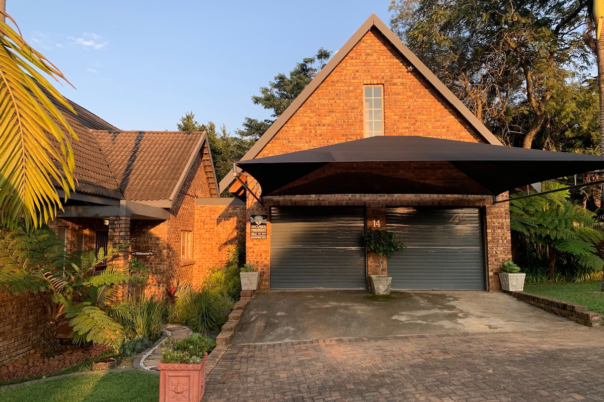 Walang PARTY na tao, pakiusap! Airconditioned, cottage na katabi ng family home.Dogs on property, not roaming freely.Cats roam freely. C.B.D,Mga Gym, mall at restaurant lahat sa loob ng 5 min. Golf course 2 min. 5 minutong biyahe ang layo ng mga ospital. Lahat ng mga paaralan sa 7 minutong radius. Stadium 12 min. International Airport 20 min drive. Madaling ma - access ang N4. Bahay na malayo sa bahay habang nasa business trip. Tamang - tama base para tuklasin ang Mpumalanga o sa ruta papunta sa Moz. NB: ANG AMING GATE AUTO LOCK SA 00H00 HANGGANG 5AM PARA SA SEGURIDAD!