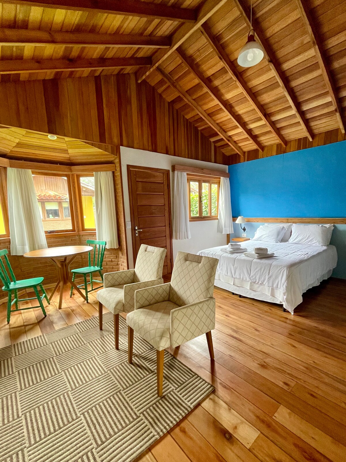 - 70 square meter Master Beija - flor chalet, sobrang komportable na may dalawang kuwarto, King size bed, Hot tub, fireplace, minibar, banyo na may kahon, 43 "4k TV (magbayad ng TV na may mga HD channel), WIFI, living room, mainit at malamig na air conditioning, hiwalay na banyo - Mini kusina, dining table, coffee maker, microwave at mga kagamitan sa kusina at isang magandang balkonahe na may tanawin ng ilog. Tandaan:. Bata hanggang sa 05 taon zero rate. Bata mula 06 hanggang 12 taong gulang 20% ng araw - araw na rate.