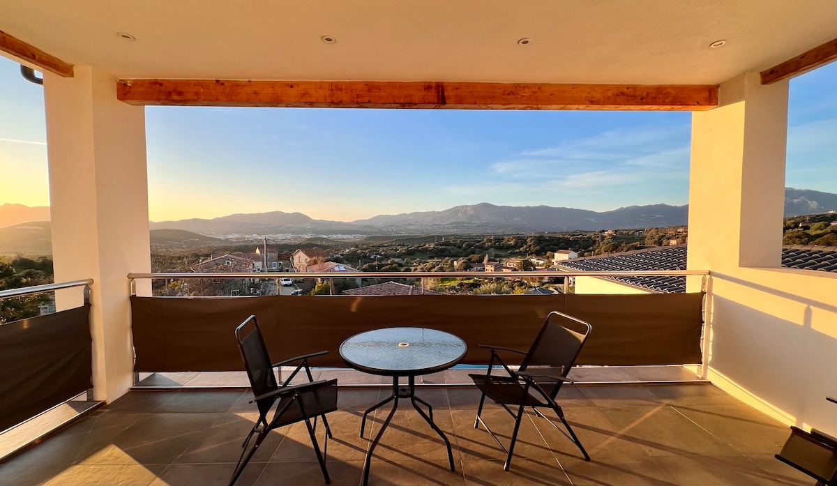 Ang aming villa ay matatagpuan sa isang wooded lot sa isang nangingibabaw na posisyon na may magagandang tanawin ng dagat at bundok. Wala pang 10 minuto ang layo nito mula sa Ajaccio airport at sa mga unang beach sa timog na baybayin. Sa pamamagitan ng pagkakalantad nito, masasamantala mo ang araw at mapapanood mo ang magagandang paglubog ng araw. Bago ang lahat ng amenidad ng villa.
