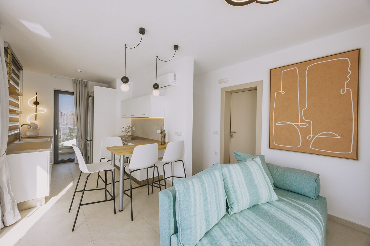 Sa pagbubukas sa maluwang na terrace kung saan matatanaw ang Dagat Cretan, nagtatampok ang 36 metro kuwadrado na apartment na ito ng hiwalay na kuwarto at kusinang may kumpletong kagamitan na may refrigerator at mga de - kuryenteng hob. Kasama ang 43' TV, ligtas, libreng Wi - Fi, mga air condition sa lahat ng kuwarto at libreng housekeeping kada 3 gabi.