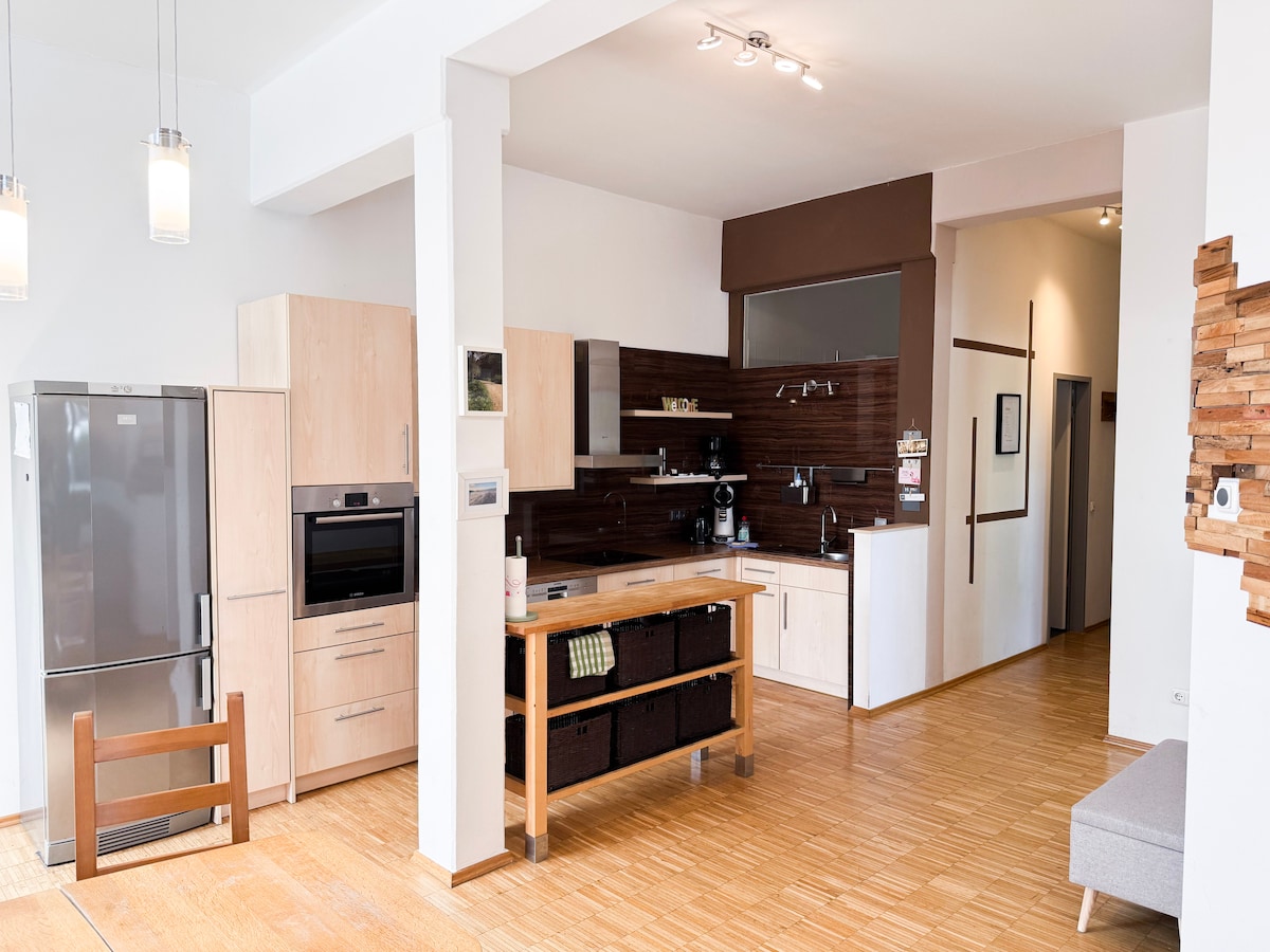 Maligayang pagdating sa iyong mapayapang bakasyunan sa labas ng Cologne! Matatagpuan ang naka - istilong apartment na may 4 na kuwarto na ito sa unang palapag ng isang mahusay na pinapanatili na bahay sa tahimik na lugar. Masiyahan sa 100 m² ng buhay na kaginhawaan na may tunay na parquet flooring, mga modernong amenidad, at maraming espasyo para sa hanggang 6 na tao. Iniimbitahan ka ng malaking terrace na mag - almusal, magtrabaho, o magrelaks sa labas. 300 metro lang papunta sa S - Bahn/RE – direkta papunta sa downtown Cologne sa loob ng 15 minuto. Mainam para sa mga biyahe sa lungsod, trade fair na pagbisita, o bakasyon ng pamilya.