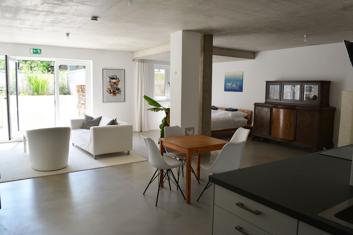 Maliwanag at komportableng loft (80sqm) para sa maximum na 4 na tao. Open - plan na kusina, banyo, hiwalay na dressing room, kamangha - manghang, malaking roof terrace. Pinapayagan ang mga alagang hayop at sisingilin ng 20,- -€ kada pamamalagi. Napakahusay na sentral na lokasyon sa downtown Düsseldorf - Oberkassel, ngunit napaka - tahimik. Ang Tram, Supermarket, Bakery, at maraming restawran ay nasa maliit na distansya, 2 -5 minuto! One - site na paradahan sa panloob na patyo nang libre!