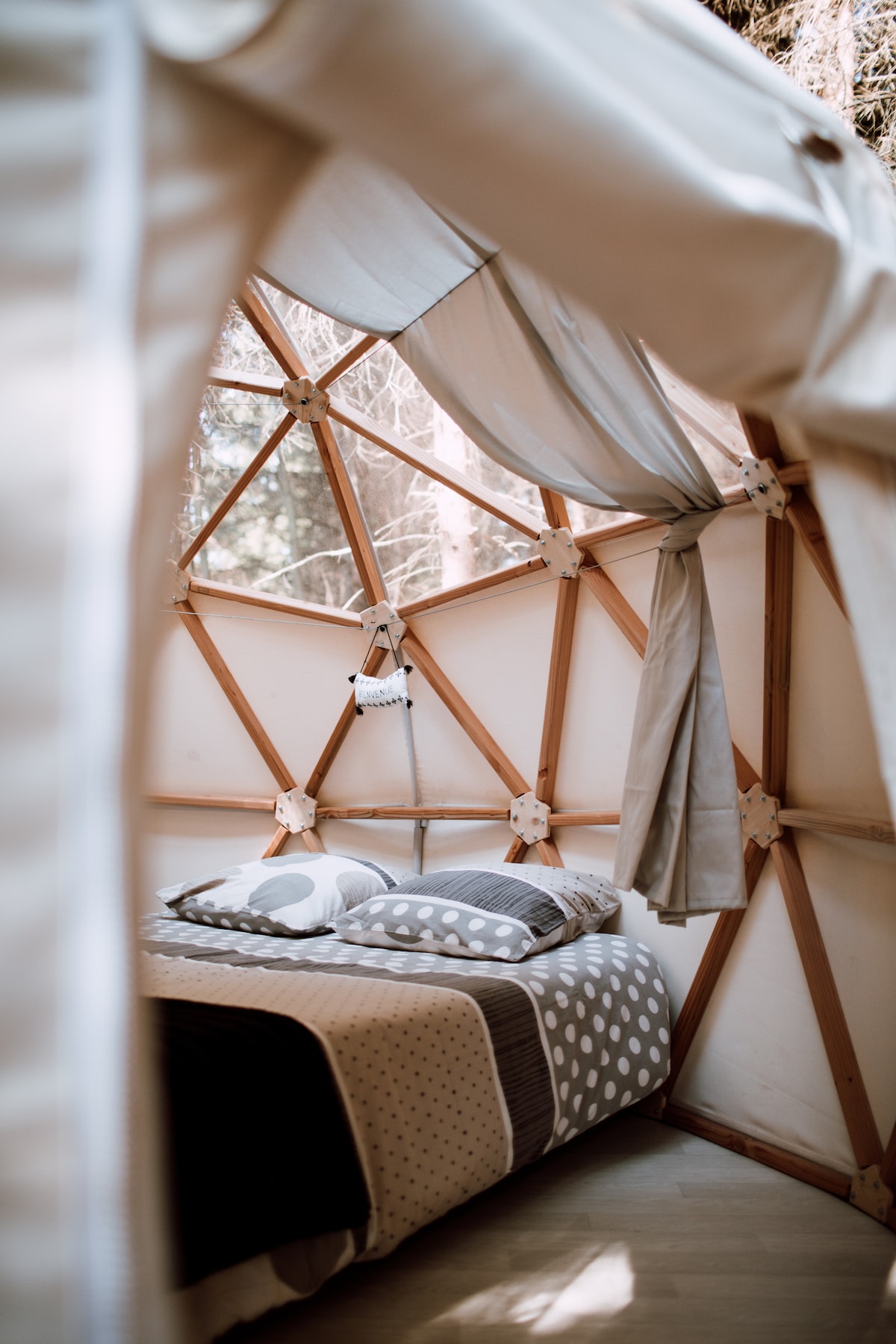 Halika at mag-enjoy sa natatanging karanasan sa sphere na ito na nakalutang sa pagitan ng mga puno at napapaligiran ng kalikasan. Binubuo ito ng komportableng higaan para sa dalawa at dalawang hiwalay na higaan sa ilalim (may heated mattress), na perpekto para sa mga bata o kaibigan. May refrigerator at mesa sa karamihan ng mga ito. May dry toilet at bahaging may tubig para magpalamig sa isang maliit na cabin na kahoy na malapit lang dito. Isang tahimik na lugar sa pagitan ng kalangitan at kalikasan para sa mga maliliit at malalaking mananaginip. May shower na 150 metro ang layo.