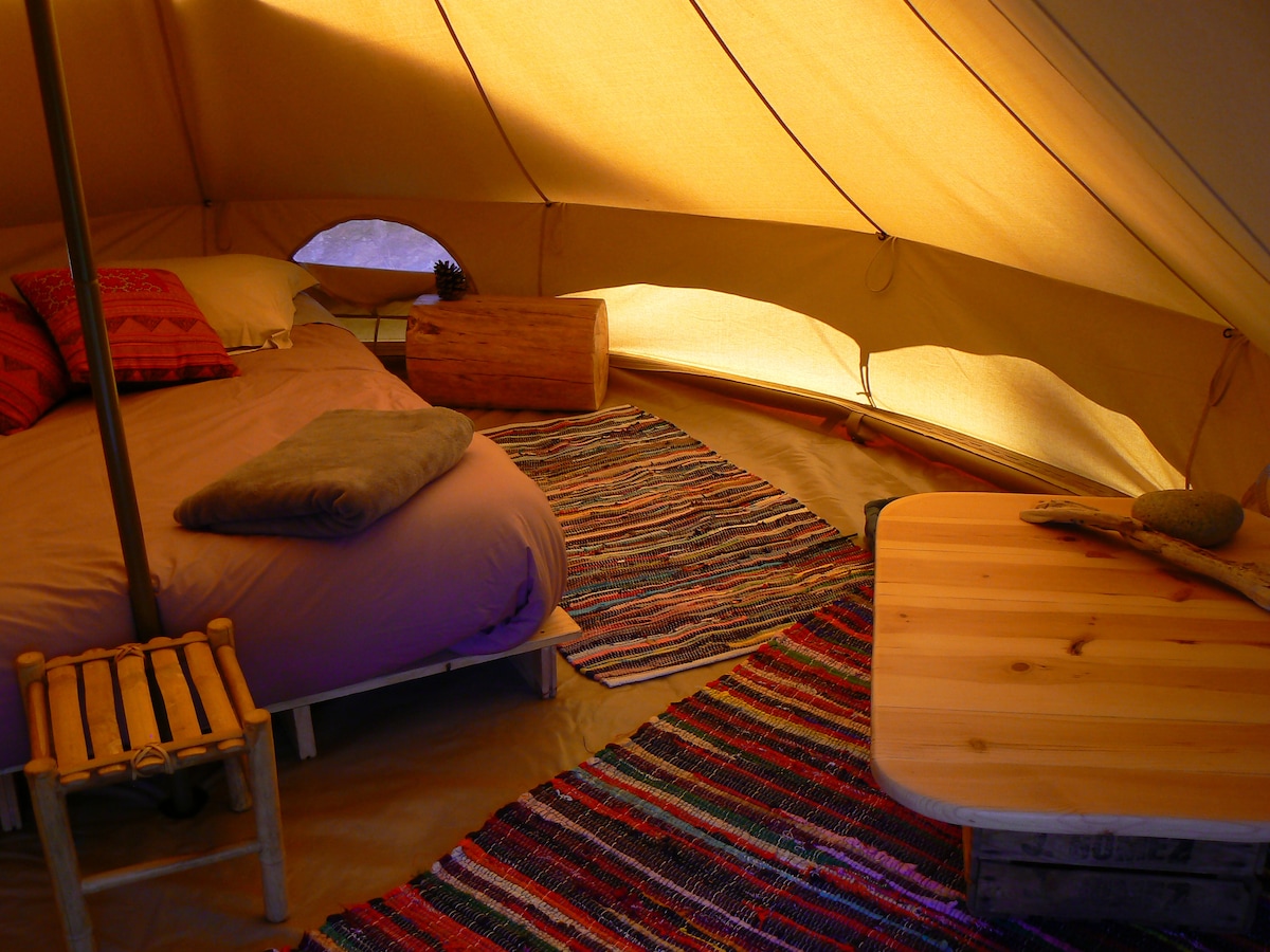 MICA, komportableng nilagyan ng tent na 12 m² purong koton, 5 minutong lakad ang ilog. Isang walang tiyak na oras na lugar. Sa parehong lugar ang WANDERING HILL: 1 iba pang tent, isang cabin sa stilts, 1 independiyenteng bahay. Ang tolda, na nakatayo sa gilid ng burol sa pagitan ng mga puno ng pino at kastanyas. 5 minutong lakad ang layo ng magandang ilog. Dito tayo namumuhay nang simple at naaayon sa kalikasan, gusto rin natin ng kaginhawaan at kalinisan. Shared na kumpletong kusina, pagtakbo at mainit na tubig Pinaghahatiang banyo at dry toilet para sa 2 magkarelasyon.