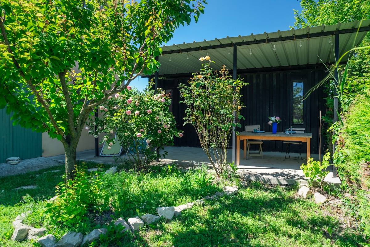Havre de paix avec vue époustouflante. container maritime recyclé en tiny house tout équipé pour deux personnes. 18m2 Idéalement organisés pour votre confort, terrasse de 55m2 pensée pour votre plus grand plaisir avec bain à remous. souvenirs inoubliables garanties. Amoureux de la nature bienvenus dans un lieu atypique, dépaysant,reposant et avant tout unique !! Petit paradis, idéalement situé en pleine nature, au cœur du Var. En hiver : fauteuils et poêle à bois extérieur vous réchaufferont !