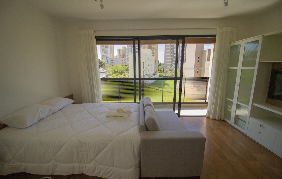Bagong apartment sa Icon building, na matatagpuan sa pagitan ng Ribeirão Shopping at Shopping Iguatemi, magandang lokasyon, katabi ng Verace pizzeria, malapit sa panaderya, botika, mga restawran, super modern na may lahat ng kailangan mo at komportable, kayang tumanggap ng hanggang 4 na tao. Naglalaman ng: Isang queen size na higaan at isang sofa bed para sa 2 tao, lahat ay may aircon. 1 paradahan Magandang pagpipilian para sa trabaho o paglilibang kasama ang pamilya. Walang bakod na pang‑proteksyon ang apartment.