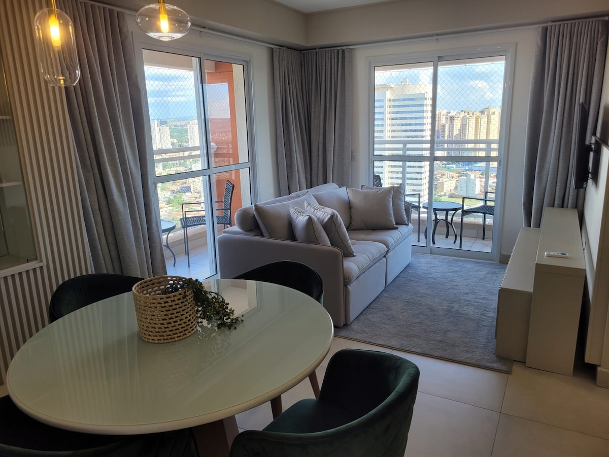 Bago at modernong studio apartment na matatagpuan sa isang pangunahing rehiyon ng Ribeirao Preto , mayroon itong Wi - Fi , air conditioning , full kitchen, 40’smart TV, BlueFit Academy sa gusali , Air fryer , espasyo sa garahe at kumpletong leisure area, swimming pool, sauna, game room, gourmet space, coworking space para sa trabaho , 24 na oras na home market at ang pinakamagandang lokasyon sa lungsod , sa Avenida Presidente Vargas 3 minuto mula sa pamimili ng Ribeirão at malapit sa pinakamahusay na mga parke , bar, bar at restaurant ng Ribeirão.