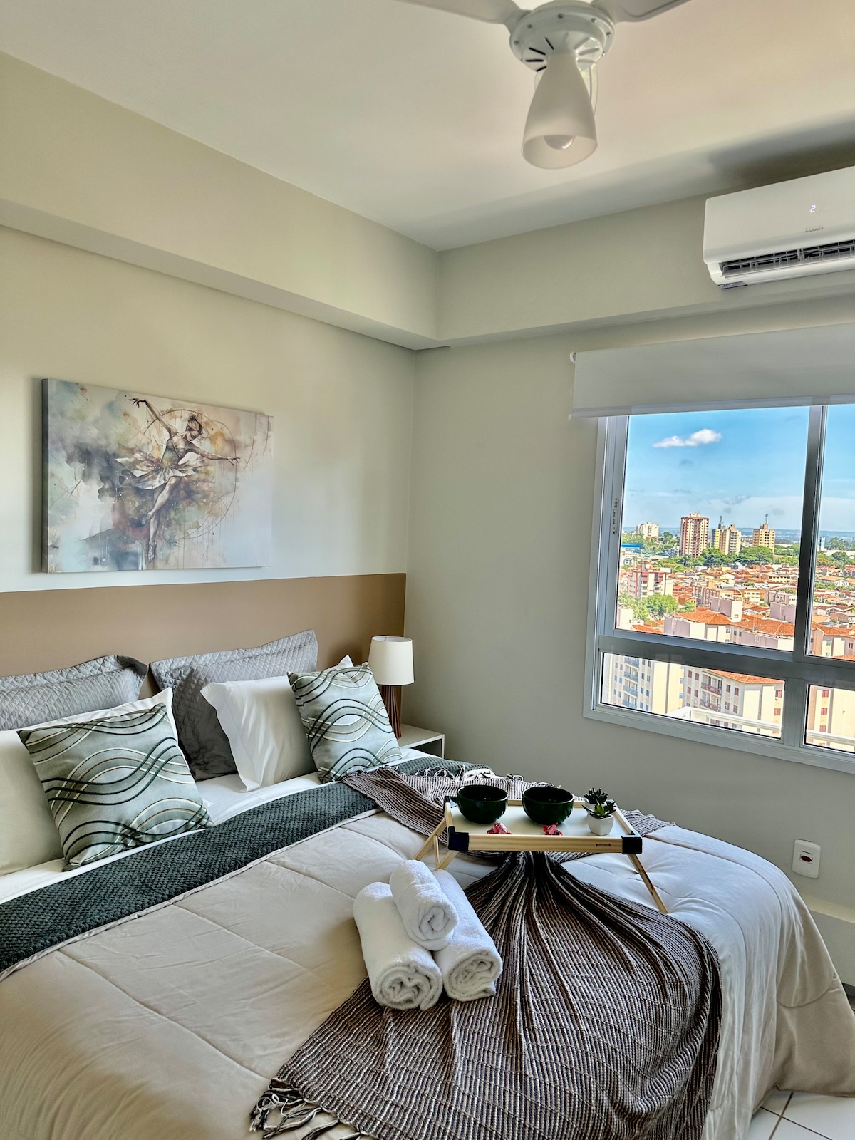 Modern at komportableng Studio, na matatagpuan sa South Zone ng Ribeirão Preto. Ganap na pinalamutian at pinlano nang mabuti, na may Queen bed (malambot), air - conditioning, ceiling fan, blackout na kurtina, Wi - fi at Smart TV na may maraming Streaming na inilabas sa iyo! Para sa mga mahilig sa serye, pagmamay - ari namin ang Netflix, Disney+, Star+ at MAX, lahat ay inilabas para sa isang magandang marathon.