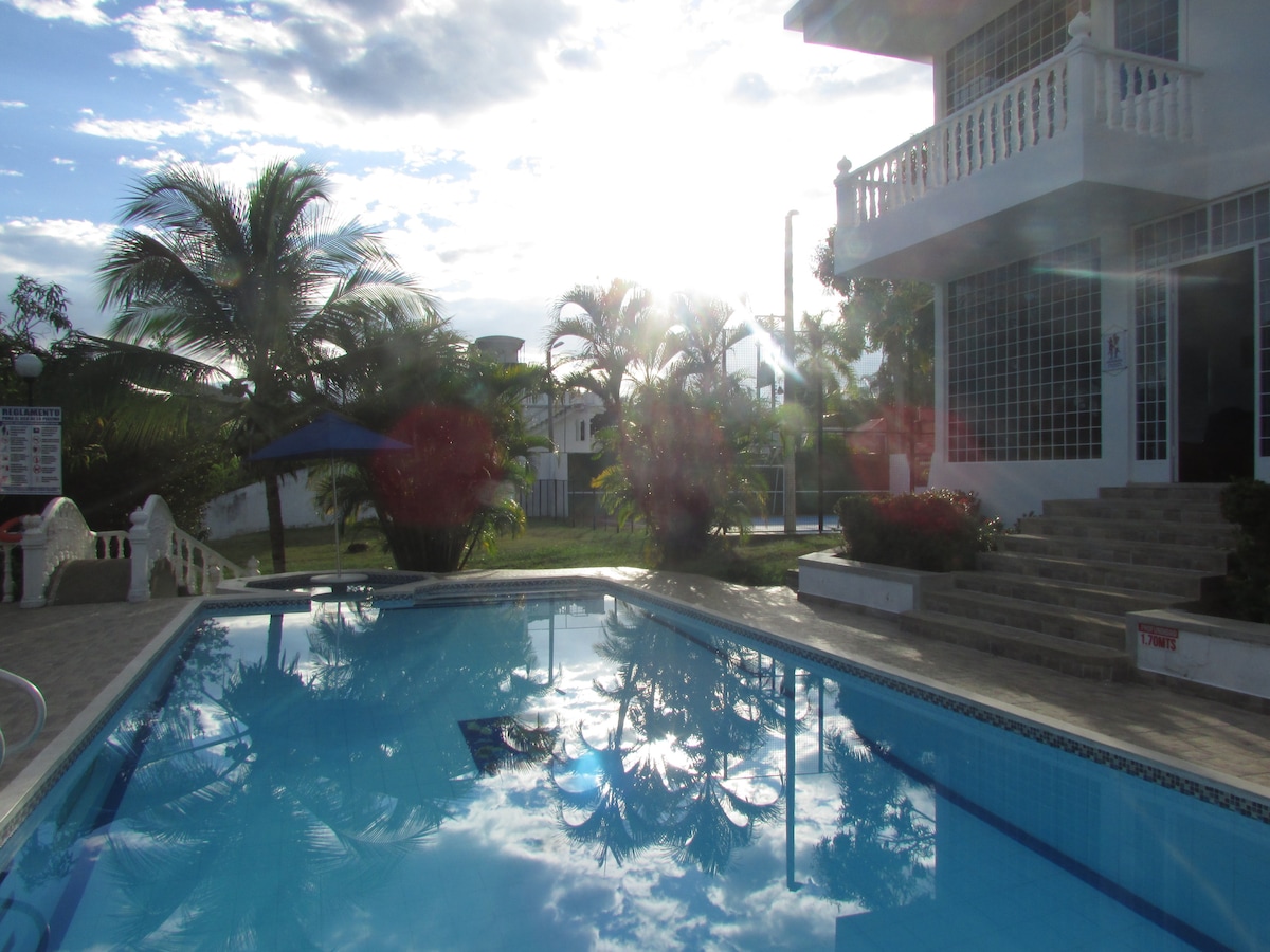 Relájate en un sitio tranquilo y elegante, en condominio. Vigilancia 7/24. Aire puro, paisajes. Clima cálido. Cocina Integral. Piscina privada, Wifi, tv. Amplio BBQ. Parrilla. Juegos de mesa, Bolirrana. 2 Parqueos internos, 2 Externos. APROPIADO para GRUPOS que respeten normas de convivencia. NO APROPIADO para GRUPOS que exigen servicio de piscina toda la noche en medio de desorden y griteria. HORARIO DE PISCINA: hasta 12 pm. Vía Nueva pavimentada hasta el sitio. Bienvenidos!!!