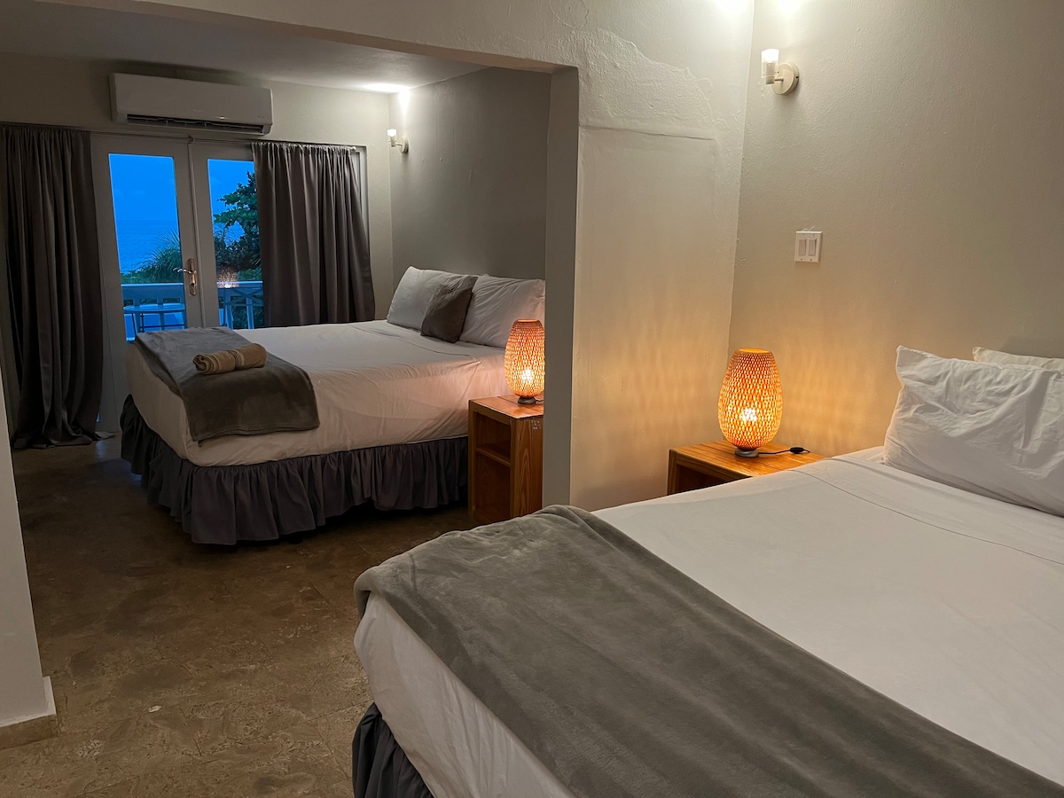 Tumakas sa tropikal na paraiso sa aming magandang 2 queen bed suite. Perpekto para sa mga pamilya o grupo ng mga kaibigan na may maximum na kapasidad na 4 na bisita. Kasama sa suite ang pribadong balkonahe na may tahimik na tanawin ng mga mayabong na puno at halaman. Kasama sa kuwarto ang maliit na refrigerator, coffee machine, TV, Wi - Fi, A/C, at hot water shower. Matatagpuan ang kuwarto sa loob ng self - catering guesthouse at naa - access lang ito sa pamamagitan ng mga hagdan. Mainam para sa alagang hayop, walang paninigarilyo. Karagdagang impormasyon sa site.