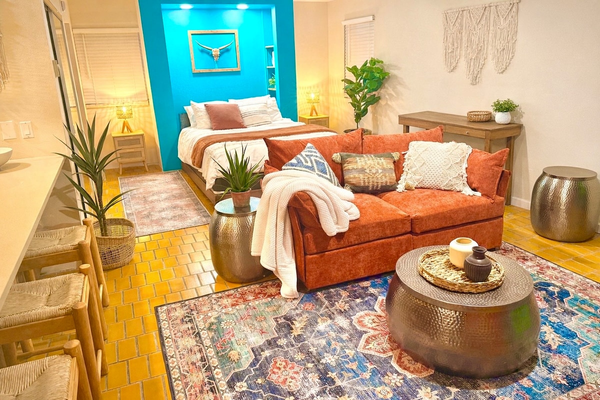 Experience a thoughtfully designed boho retreat in El Prado, just minutes from Taos. This cozy studio blends warm textures, desert charm, and mountain views for a relaxing, boutique-style stay. Enjoy a fireplace, fully equipped kitchen, fast WiFi, and access to a hot tub and seasonal pool. Perfect for couples, solo travelers, or remote work—unwind, explore, and recharge in a peaceful Southwest setting.