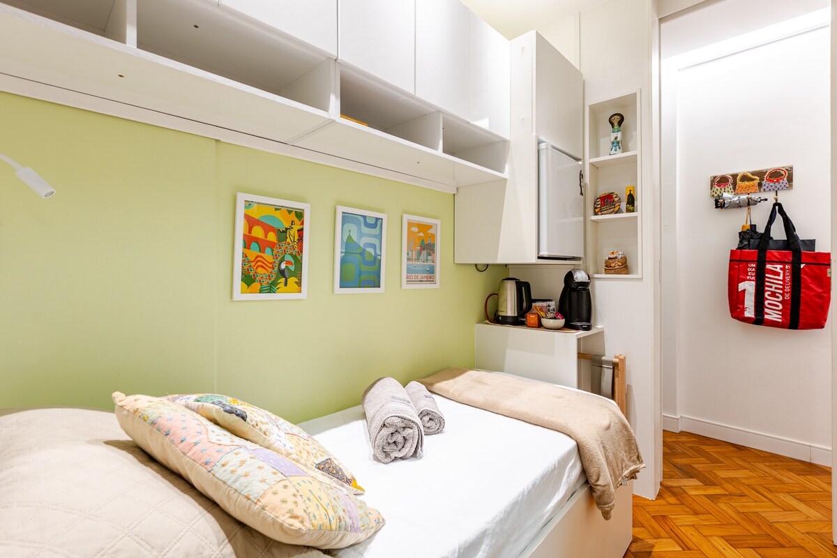 Malayang access sa maliit na espasyo (11 m²) na may air conditioning, lababo na may 2 burner cooker, refrigerator at microwave. Pribadong banyo. Cable tv at wi - fi, 500 metro mula sa Siqueira Campos Metro at 2 bloke mula sa beach. Nagretiro na ang lahat ng bagong tuluyan. Tumatanggap ng hanggang 2 tao.
