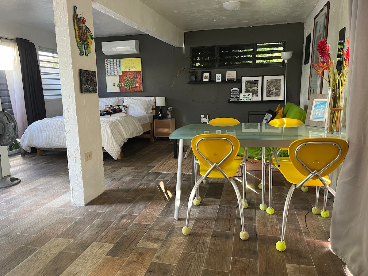 You will stay in this cozy Luquillo studio, perfectly located near the main highway for easy access to Luquillo Beach, the famous kiosks, and El Yunque. You will be 28 minutes from San Juan Airport and close to ferry terminals for Culebra and Vieques, ideal for couples or transit vacationers. Your own gated entrance, a relaxing deck with a jacuzzi, full kitchen. Industrial vibe finishes, a dedicated workspace, high-speed WiFi, and a brand-new A/C unit—everything you need for a perfect getaway!