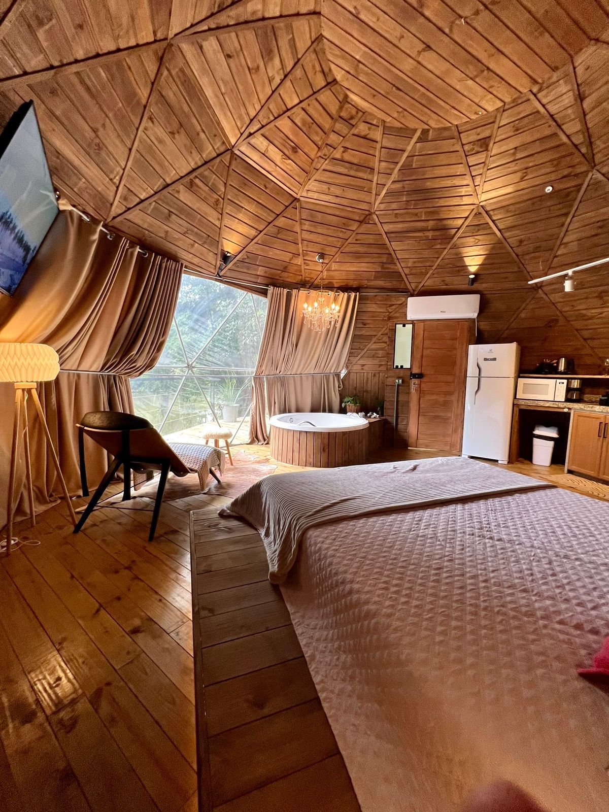 Ang aming geodesic Domo lahat ay may linya sa loob ng kahoy, pati na rin ang acoustic at thermal insulation. Sa isang ganap na naiibang disenyo, ang cabin na ito ay may kamangha - manghang tanawin ng lawa, at isang deck na may apoy sa lupa sa mga pampang ng dam, ang pakiramdam ng pagiging sa cabin na ito ay naiiba. Mayroon kaming "take and pay" na grocery store na gumagana nang 24 na oras, isang hardin ng komunidad para sa iyo na anihin ang iyong mga pampalasa at isang lounge deck sa lawa upang tamasahin ang mga espesyal na sandali. "Isang lugar para marinig ang pagtatanim ng damo"