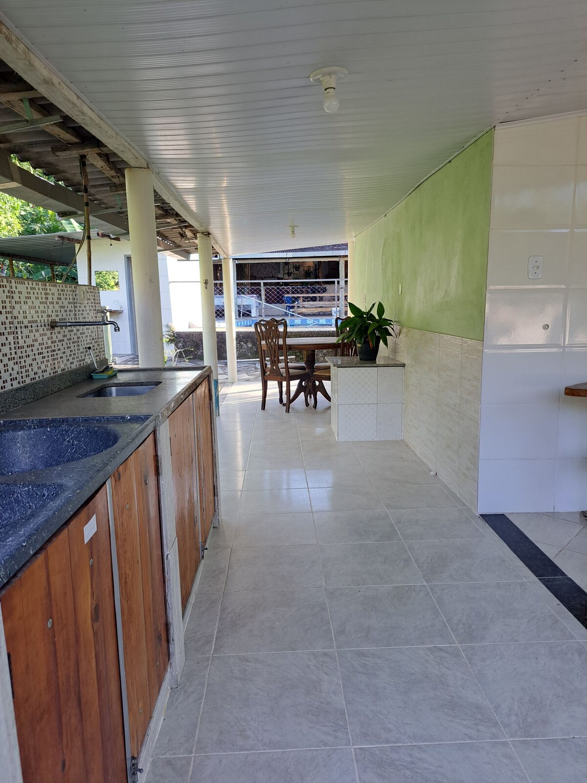 Casa com 4 quartos sendo 1 suíte + 1 banheiro social, sala c sofá cama TV a cabo, WIFI, cozinha ampla c mesa de madeira c 6 cadeiras , áreas externa c + 2 mesas de madeira . piscina + 2 banheiros externo , churrasqueira, fogão a lenha c forno + 1 fogão de 2 bocas industrial. Uma ampla área Kids com escorregador, gangorra e balanço. 2 lagos c Jardim de inverno e lareira externa , raia de bocha e sinuca . uma pequena cachoeira c água corrente e mini Pomar.