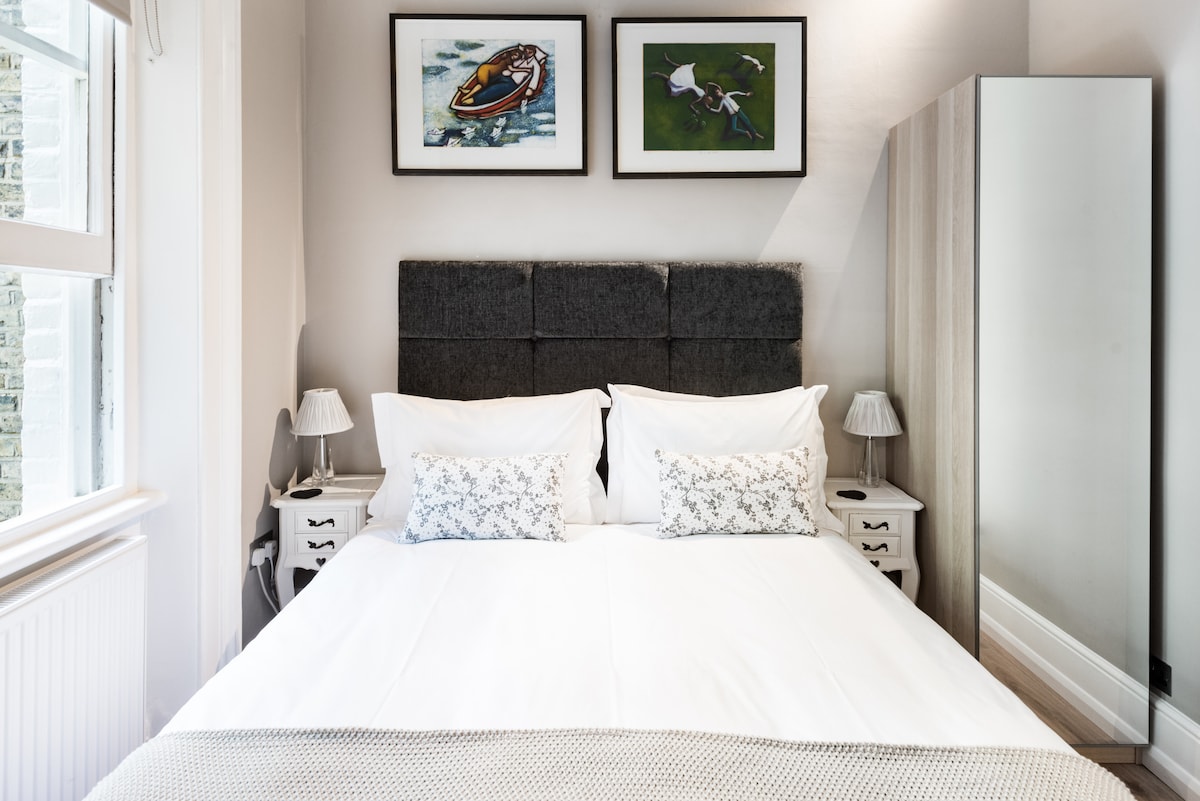 Welcome sa aming bahay na may Victorian style sa Westminster, London! - 2 kuwarto na kayang tumanggap ng hanggang 3 bisita - Master bedroom na may king-sized na higaan at 55" Smart TV - Maaliwalas na sala na may mga komportableng sofa at 65" HDR Smart TV - Kumpletong kusina na may mga modernong kasangkapan - Kumpletong banyo na may shower, paliguan, at mga pangunahing gamit sa banyo - Mga natatanging Victorian na tampok tulad ng mga umiirit na floorboard at mga kaakit-akit na sash window