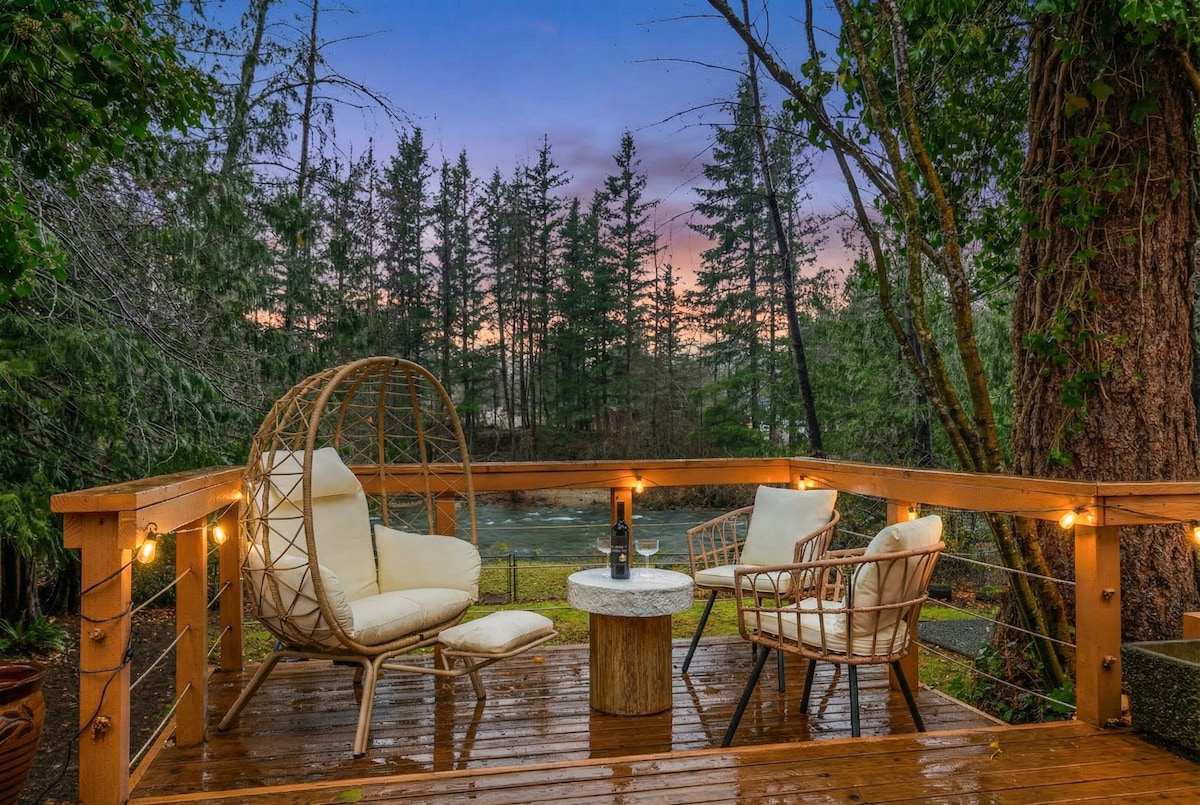 Maligayang Pagdating sa North Zen by Riveria Stays - isang kaakit — akit na bakasyunan sa tabing - ilog na nakatago sa kahabaan ng Snoqualmie River. Nakapalibot sa rustikong boho cabin na ito ang mga matatandang puno na hindi natutuyo ang mga dahon kaya puwede kang magrelaks at magsaya. Magbabad sa pribadong hot tub sa ilalim ng mga bituin, magpahinga sa tabi ng gas fireplace, o tumira sa mga upuan ng Adirondack sa tabing - ilog habang pinapagaan ng banayad na tunog ng tubig ang iyong diwa. Hayaan ang kagandahan at kagandahan ng aming cabin sa ilog na magdala sa iyo sa isang lugar ng kapayapaan, kamangha - mangha, at walang hanggang katahimikan.