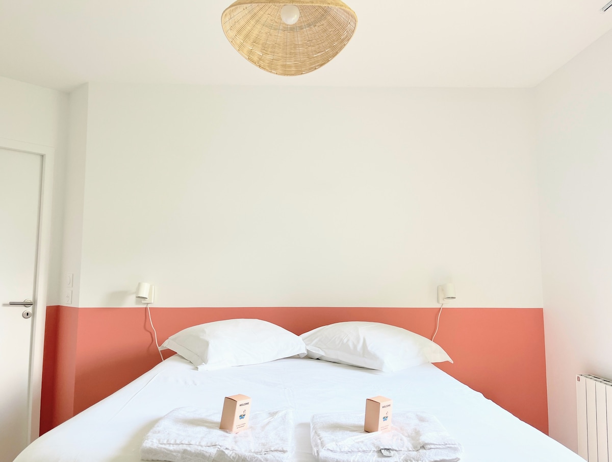Natatanging accommodation na may tanawin ng daungan nito mula sa deck at interior, access sa port - mga tindahan na 5 minutong lakad at 10 minuto papunta sa unang beach. Ang apartment ay 35m2, kabilang dito ang: - Pasukan na may laundry closet - isang hiwalay na silid - tulugan na may isang kama ng 140*190 - banyo - isang Living Room/Living room/Kusina ng 20m2 - terrace kung saan matatanaw ang condominium park. Pinapayagan ang mga alagang hayop na napapailalim sa: pagsunod sa mga alituntunin at pag - check in na ibu - book. Walang dagdag na bayarin.