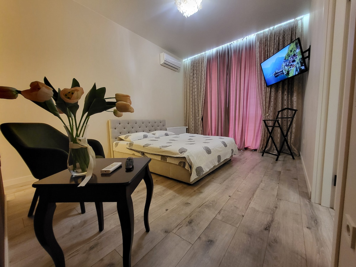 Mag-enjoy sa magandang kapaligiran ng apartment na ito sa sentro ng lungsod. Bagong apartment na may designer renovation para sa komportableng pamamalagi ng aming mga bisita. Ang kuwarto ay may double bed na may orthopedic mattress at kumportableng sofa. Palaging may malinis at bagong labang kobre-kama para sa mga bisita. May smart TV at Wi-Fi sa kuwarto. Ang kusina ay may mesa, microwave, stove at refrigerator. May mga pinggan at electric kettle na may kape at tsaa para sa mga bisita. May seguridad at paradahan para sa kotse at charging para sa electric car.