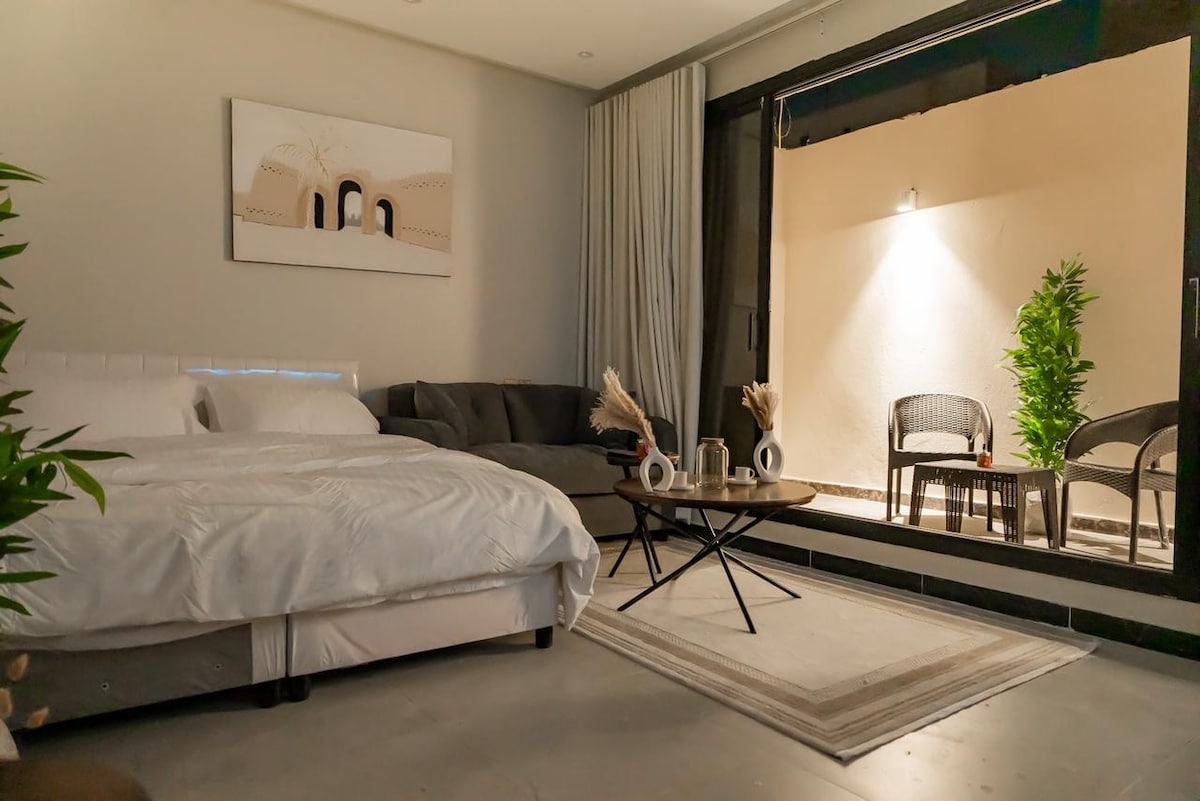 Experience a unique experience in a private Artist Studio offering relaxation and comfort. The studio includes a bed and a side seating area where you can enjoy watching on a 65-inch smart screen. There's also a separate kitchenet and a coffee to serve all your needs and stylish outdoor area with fire pit. location is close to all services, the tourist destination, and Riyadh Season areas (Boulevard,Arena,Etc) within a 5-minute. We would love to host you and share the experience with us!
