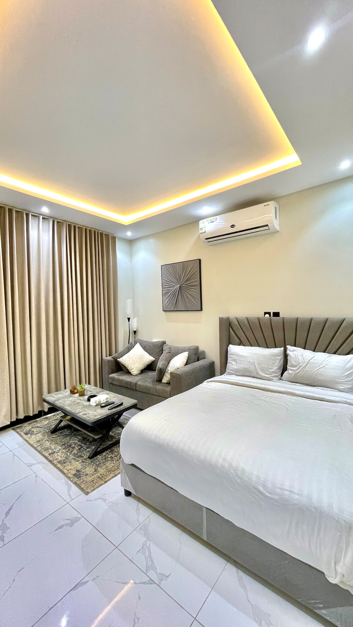 Magrelaks sa mararangyang at tahimik na apartment na ito, na binubuo ng king bedroom, sala kung saan matatanaw ang pribadong outdoor garden, outdoor seating area, at kumpletong kusinang Amerikano. Idinisenyo sa estilo ng mga hotel. Matatagpuan sa hilaga ng Riyadh, malapit sa Riyadh Season at mga kaganapan, at 15 minuto mula sa Riyadh International Airport. Masiyahan sa libreng gym, pampublikong lounge at pampublikong walkway na nakatuon sa complex, Kabilang ang libreng Wi - Fi May bayad ang serbisyo sa paglalaba.