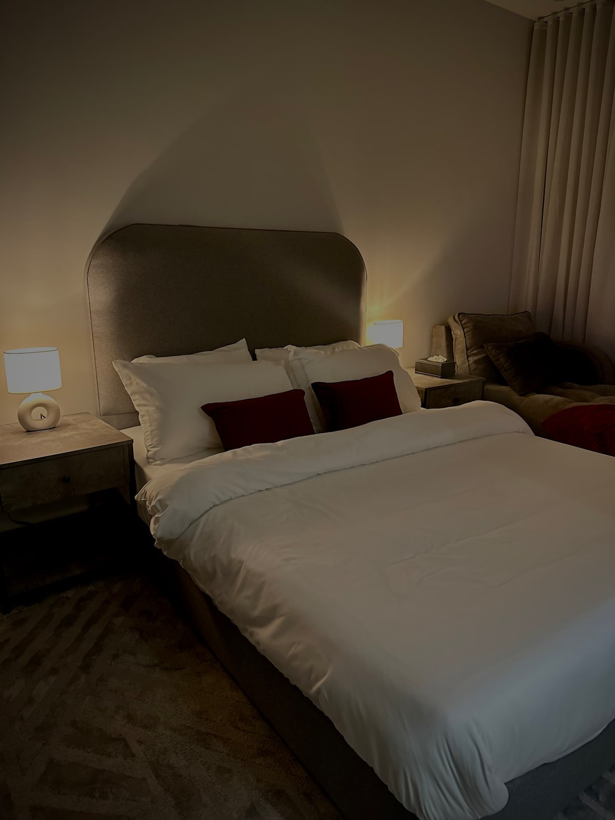 Modernong hotel apartment na may 1 kuwarto sa tahimik na lugar. Sariling pag-check in, WiFi, medical mattress, premium sofa, coffee corner, mga amenidad ng hotel, at kumpletong kusina. • Pangunahing lokasyon sa North Riyadh, 1 km mula sa North Ring Rd: • Paliparan: 12 min • Financial Center: 15 minuto • Riyadh Park, Nakheel, Granada Mall: 10–20 minuto • Riyadh Season at Boulevard: 15–20 min • Imam, Princess Noura & e-University: 10–15 min • Tandaan ⚠️ Araw-araw na paglilinis na parang sa hotel kapag hiniling.