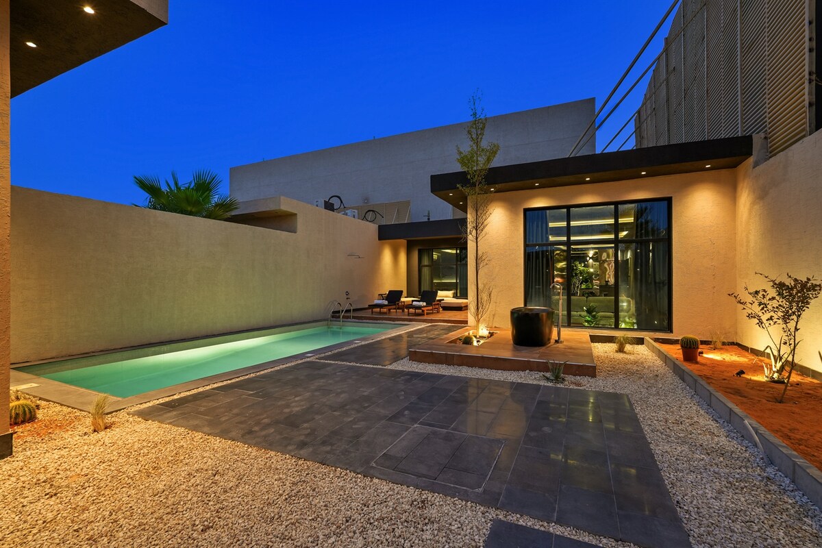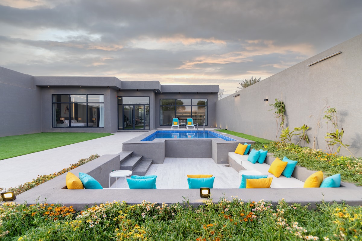 Natatanging chalet ng taga - disenyo ng arkitektura Matatagpuan ito malapit sa hilaga ng kabisera, ang Riyadh, malayo sa kaguluhan ng lungsod, para ma - enjoy mo ang tahimik na pamamalagi. Ito ay nailalarawan sa pamamagitan ng pagkakaroon ng isang pangunahing majlis bilang karagdagan sa isang karagdagang majlis sa sesyon ng Arabic, at isang kahanga - hangang tanawin ng santuwaryo at sa labas ng hardin upang magarantiya sa iyo ng isang hindi malilimutang karanasan para sa iyong mga kaganapan at kasal.