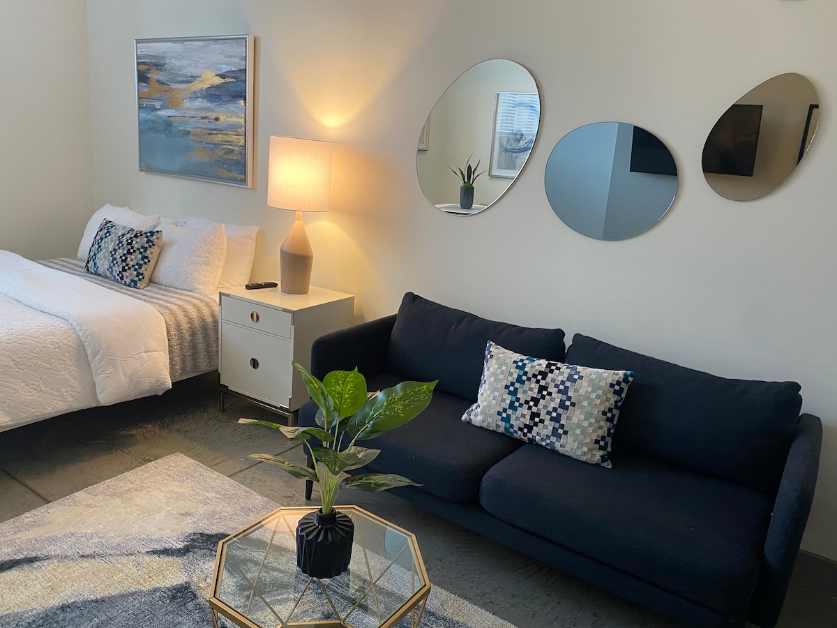 Kuwartong may king‑size na higaan, washing machine, dryer, air purifier, at 75" TV
