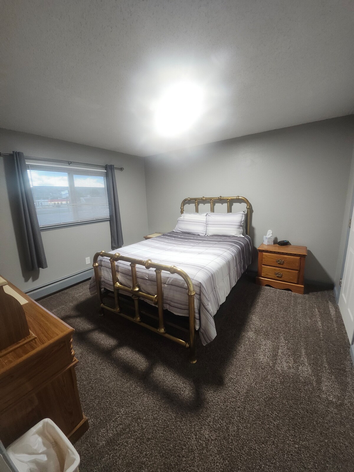 "No - frills" 1 Pribadong Single bedroom na may ensuite bath. May 1 King size na higaan. Kasama rito ang ensuite na banyo na may pinaghahatiang lugar para sa paglalaba na may washer at dryer. WALANG access ang unit na ito sa anumang bahagi ng gusali, walang access sa kusina o sala. Matatagpuan sa kalye mula sa magandang parke at malapit lang sa lugar ng downtown. Available para sa mga matutuluyang gabi. Malapit ka sa lahat kapag namalagi ka sa sentral na lugar na ito.