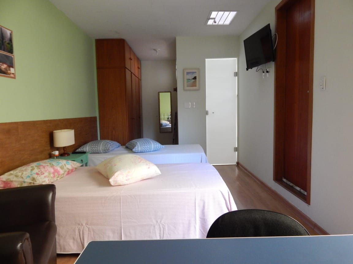 EdÃcula totalmente independente, tranquila c/wi-fi: - Espaçosa suÃte andar superior c/piso laminado, ar condicionado TV 32" Smart, guarda-roupas, 1 ou 2 camas de solteiro ou 1 de casal, escrivaninha e poltrona. - Banheiro exclusivo c/espaçoso box e chuveiro eletrônico c/regulagem temperatura. - No térreo, cozinha c/pia, purificar água refrigerada Consul, microondas, frigobar, fogão à gás 2 bocas e forno. - Bairro residencial muito tranquilo e muito arborizado. Comércio de conveniência a 1km.