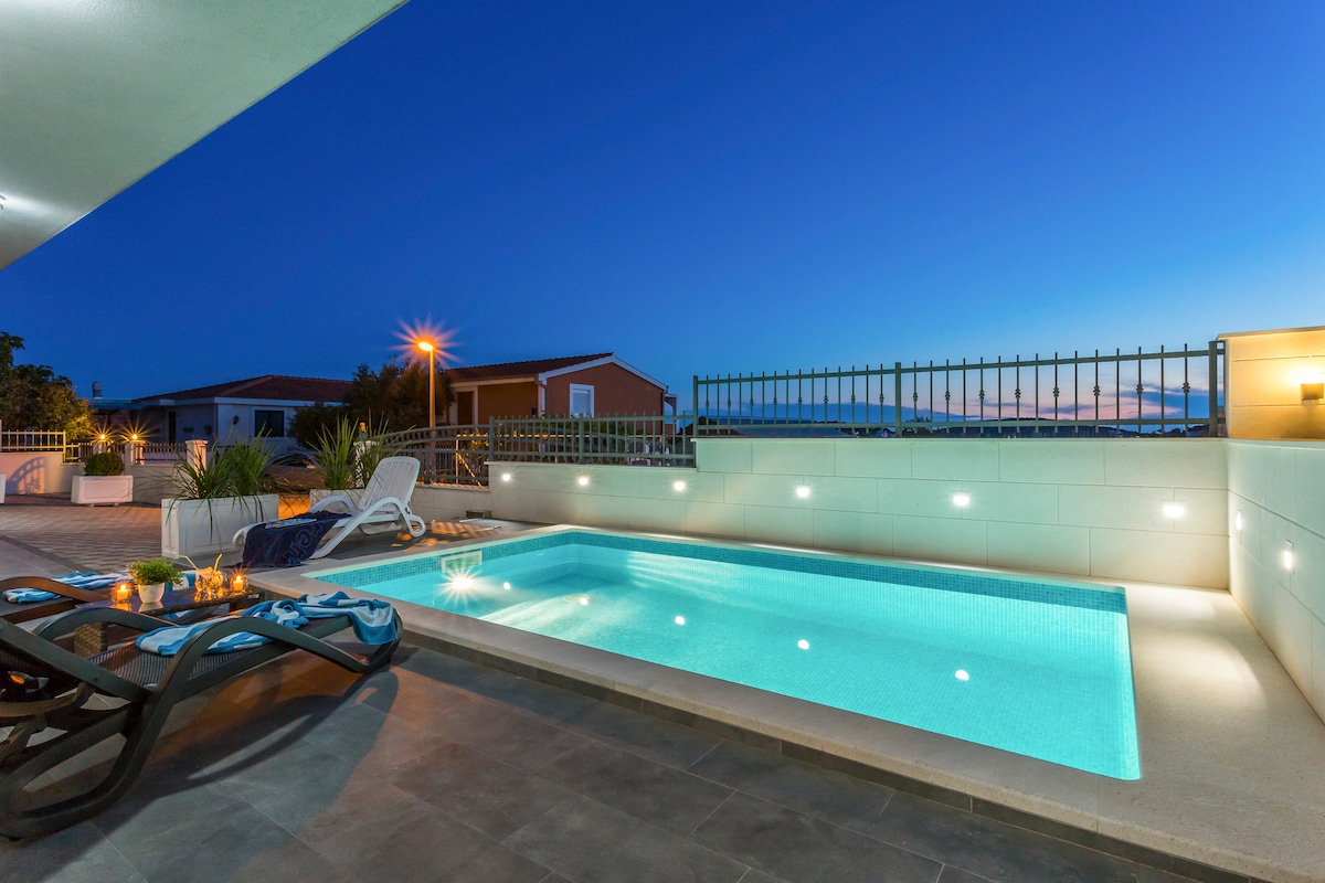 Ang Villa Fox Exclusive ay bagong itinayo at kumakatawan sa moderno at marangyang estilo sa baybayin ng Dalmatian. Matatagpuan ang Villa sa tahimik at mapayapang lugar na may mga nakakamanghang tanawin ng Mediterranean sea at mga isla. Napapalibutan ng mga halaman ng autochthon, puno ng oliba at palma, villa na nag - aanyaya sa iyo na gumastos ng maganda at nakakarelaks na pista opisyal kasama ang iyong pamilya at mga kaibigan. Ang pinainit na swimming pool at kalapit na beach ay ginagawang magandang lugar ang villa na ito sa panahon ng pamamalagi mo sa Croatia.