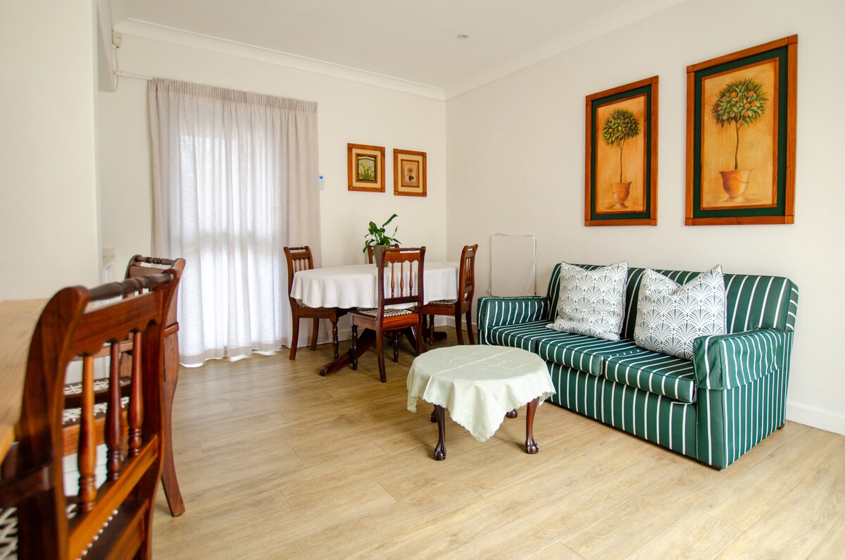 Mayroon kaming buong solar na naka - install kaya walang problema ang pagbubuhos ng load. Isa itong maluwag na kuwartong may Queen size bed at banyong en suite. Bukas ang mga pinto sa France sa pribadong kitchenette at dining terrace. Magbibigay kami ng Filer coffee/tea/gatas para masiyahan ka sa iyong paglilibang. Ang isang hiwalay na pasukan sa hardin at ligtas na off - street na paradahan ay nagbibigay - daan sa iyo na pumunta at pumunta ayon sa gusto mo. May gitnang kinalalagyan sa malabay na suburbs ng Claremont, kami ay 20 minuto mula sa parehong sentro ng lungsod at ilang pangunahing atraksyong panturista.