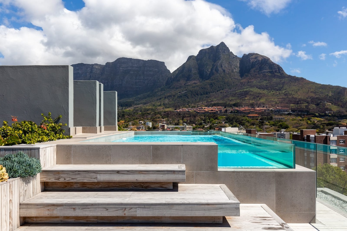 Ganap na inayos na studio apartment na may malabay na tanawin ng bundok sa mataas na hinahangad na gusali ng marangyang apartment sa Newlands Peak. May rooftop deck, swimming pool, indoor at outdoor gym, mga pasilidad ng barbecue, laundromat, coffee shop, at 24 na oras na seguridad: talagang walang dahilan para umalis! Matatagpuan sa gitna - malapit sa University of Cape Town, Newlands Forest, Kirstenbosch Botanical Gardens, Newlands Cricket Ground, Cavendish Square Mall, at 20 minutong biyahe lang mula sa Table Mountain.