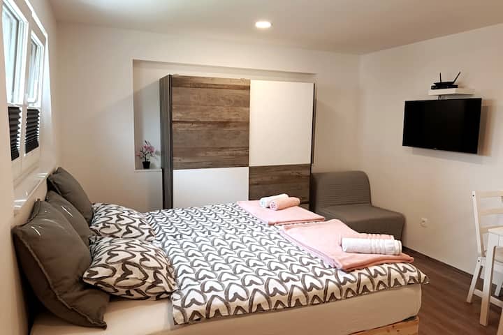 Matatagpuan ang Studio Mici sa magandang lokasyon malapit sa lawa at sa sentro ng Bled. Nag - aalok ang studio na may sariling patyo ng maganda at komportableng pamamalagi.