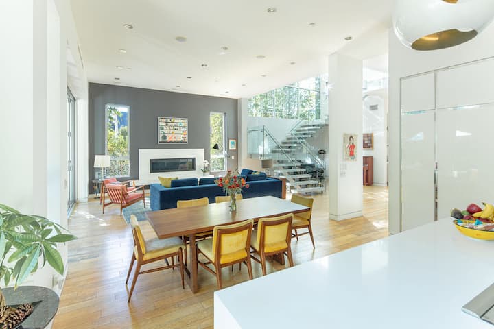 Maligayang pagdating sa aming pribado at marangyang tuluyan na mainam para sa alagang hayop, na matatagpuan sa gitna ng Los Angeles. Idinisenyo ang tuluyan para maging perpekto na may malaking pasukan, mga fireplace sa sala at pangunahing silid - tulugan, at mga pader ng salamin na nakapalibot sa lumulutang na hagdan na may dramatikong chandelier para sa mga dramatikong optika. Puwedeng umangkop ang pribadong driveway sa dalawang kotse.