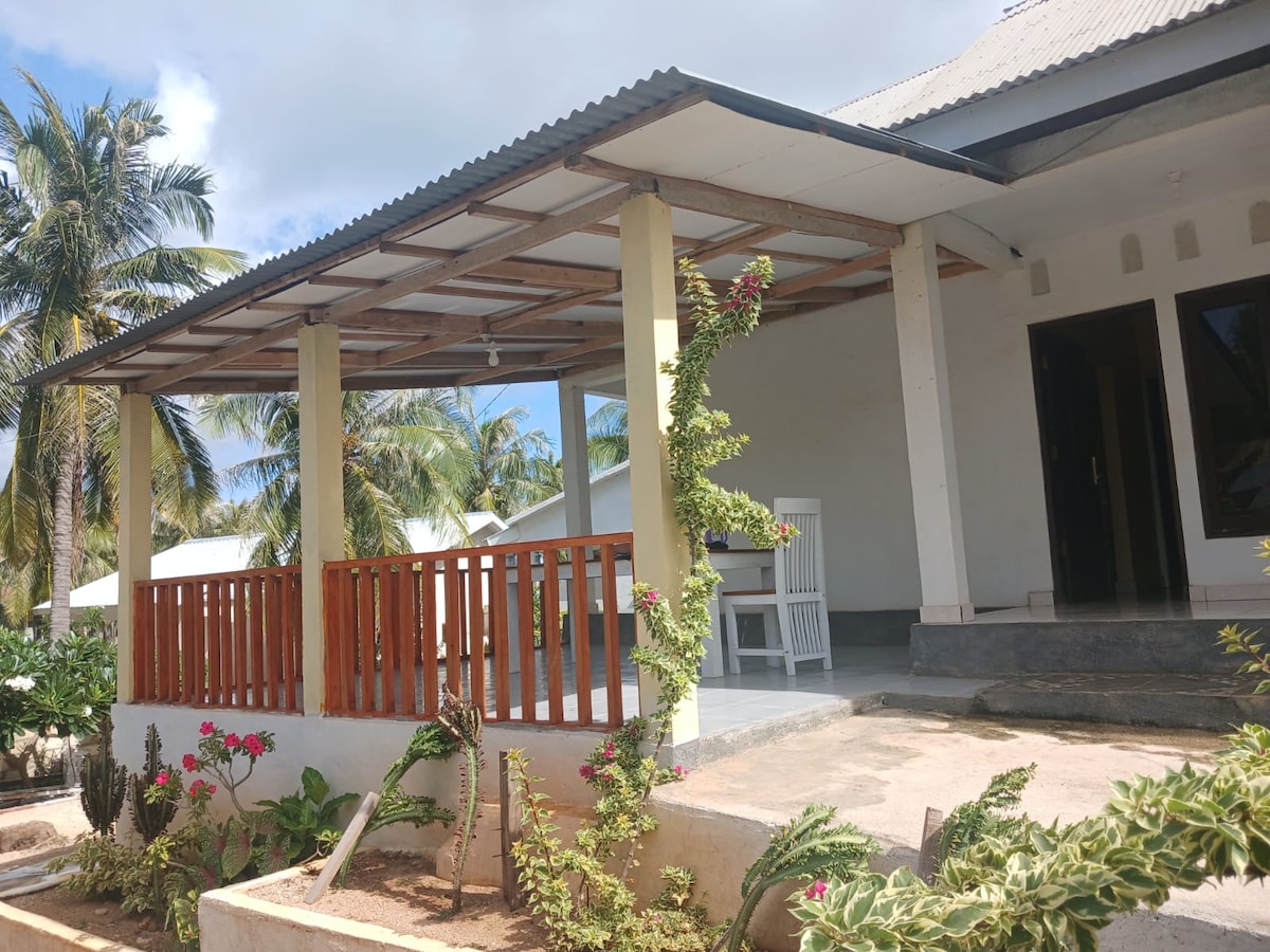 Welcome to UME KELAPA Bungalow 3 A peaceful tropical retreat set on a spacious 3000 sqm property near the very heart of Nemberala. Surrounded by lush gardens filled with flowers and vegetables, this home offers privacy, space, and a true island-living experience while staying close to daily conveniences.