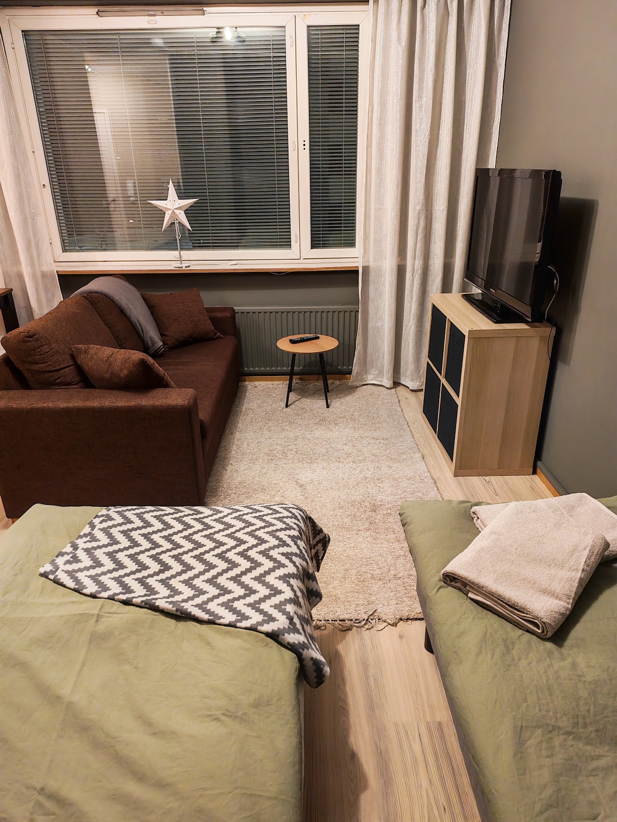 Studio na may banyo. mga kasangkapan sa kusina at dalawang higaan. Nasa maigsing distansya mula sa sentro ng lungsod, mga restawran at shopping mall (5 minuto). Malapit din ang hintuan ng bus papunta sa nayon ng Santa. Puwedeng mag - ayos ng mga maikling biyahe papunta sa cottage sa labas ng Rovaniemi nang may dagdag na bayad. Keskusta, ravintolat ja ostoskeskukset vain 5 min kävellen. Korundi 350m Arktikum 350m