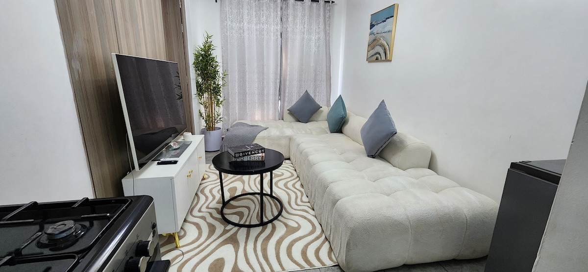 Maligayang pagdating sa iyong naka - istilong pagtakas sa lungsod! Isang pinag‑isipang idisenyong 1 kuwarto sa gitna ng Roysambu na nag‑aalok ng perpektong kombinasyon ng kaginhawaan, pagiging elegante, at kaginhawaan. May komportableng sofa, 50‑inch na smart TV na may Netflix at iba pang app, at mabilis na Wi‑Fi sa sala. Pinupuno ng natural na liwanag ang tuluyan sa araw, habang ang malambot na ilaw ay nagtatakda ng nakakarelaks na mood sa gabi. Ang kuwarto ay isang tahimik na kanlungan na may malambot na queen-sized na higaan May refrigerator, microwave, at mga pang‑luto sa kusinang malinis at kumpleto sa gamit.