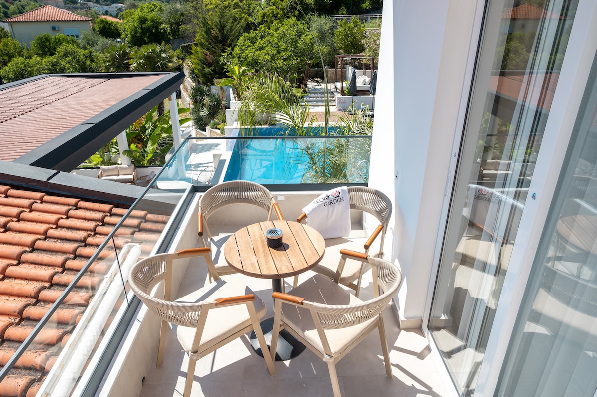 Luxury accommodation on an old family property, 4,5km awey from the centre of Bar.You are to enjoy an authentic Mediterranean ambience surrounded by a 15.000m2 garden, with the planted subtropical fruit and olive trees, providing the utmost privacy and peace. The villa Tai is accompanted by a private infinity pool and a 90m2 terrace offering on unforgettable view of the Adriatic see and the town. You will have a rare opportunity to drink spring water. Free parking space and video surveillance provided.