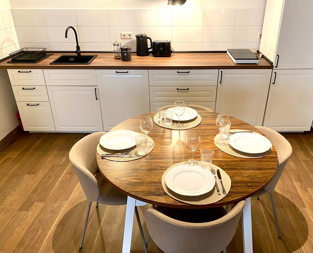 - Simula 2024, bagong inayos at dinisenyo namin ito nang komportable para sa aming mga bisita - Ang aming tantiya. 40 m² non - smoking Ang apartment ay para sa 2 -3 tao. - Mayroon itong hiwalay na pasukan at tahimik Sun terrace. - May malaking sala / tulugan malaking double bed, sofa bed, malaking armchair at satellite TV. - Nag - aalok ang maliit na modernong maliit na kusina ng lahat Mga opsyon sa self - catering. - Kasama ang banyo Glass shower, underfloor heating, at hair dryer.